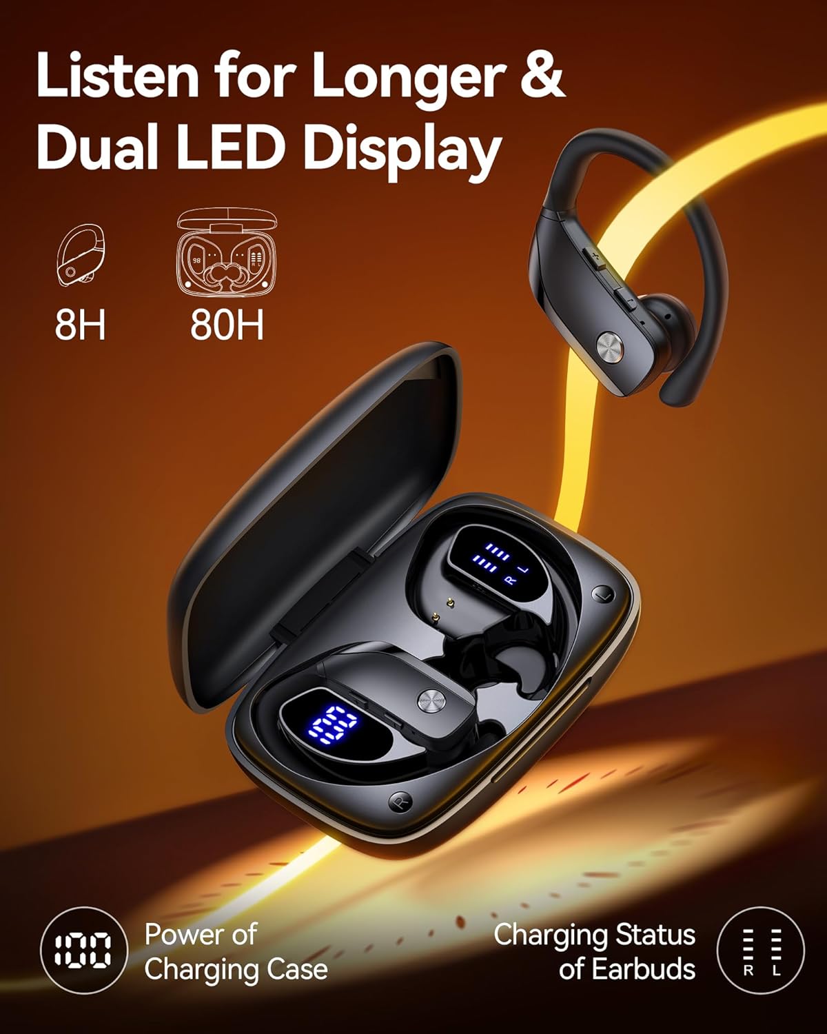 bmani Ear Buds Wireless Earbuds Bluetooth Headphones with 80H Playtime LED Display Case, Over-Ear Hook with Mic, Stereo Sound, Easy Button Controls, Sports Earphones for Running Workout Gym Black