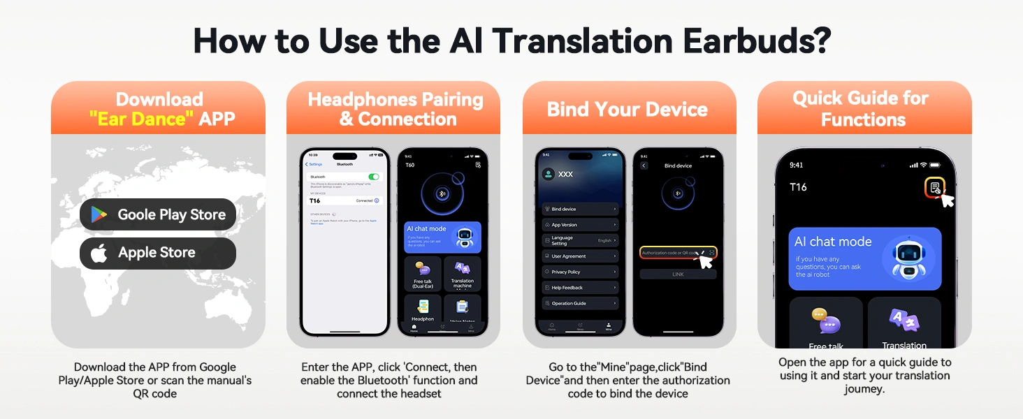 - 9 Functions & 5 Translation Modes: These translation earbuds real time are fully unlocked after activation, giving you access to all translation features and the app with no subscription or extra fees. The language translator earbuds support five modes: Free Talk, Headphone + Phone, Audio/Video Call, Photo Translation, and Translation Machine, ideal for travel, learning, and meetings. All 9 functions are free, with regular app updates for more languages and higher accuracy.