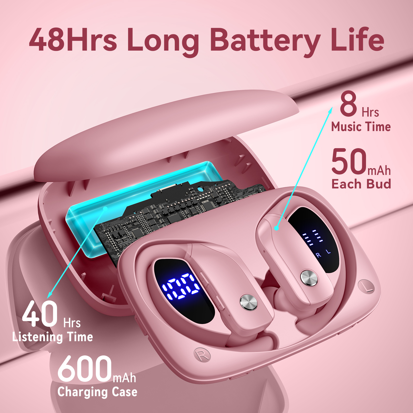 bmani Wireless Earbuds Bluetooth Headphones 48hrs Play Back Sport Earphones with LED Display Over-Ear Buds with Earhooks Built-in Mic Headset for Workout Pink